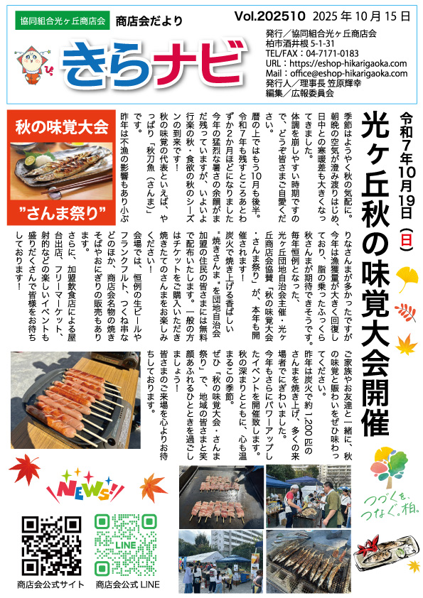季節はようやく秋の気配に。朝晩の空気が澄み渡りはじめ、日中との寒暖差も大きくなってきました。 体調を崩しやすい時期ですので、どうぞ皆さまご自愛ください。暦の上ではもう10月も後半。 令和7年も残すところあとわずか2か月ほどになりました今年の猛烈な暑さの余韻がまだ残っていますが、いよいよ行楽の秋・食欲の秋のシーズンの到来です! 秋の味覚の代表といえば、やっぱり「秋刀魚(さんま)」です。 昨年は不漁の影響もあり小ぶりなさんまが多かったですが今年は漁獲量が大きく回復しており、 脂の乗ったふっくら秋さんまが期待できそうです。 毎年恒例となった、光ヶ丘団地自治会主催・光ヶ丘商店会協賛「秋の味覚大会・さんま祭り」が、 本年も開催されます! 炭火で焼き上げる香ばしい“焼きさんま”を団地自治会加盟の住民の皆さまには無料で配布いたします。 一般の方はチケットをご購入いただき焼きたてのさんまをお楽しみください! |